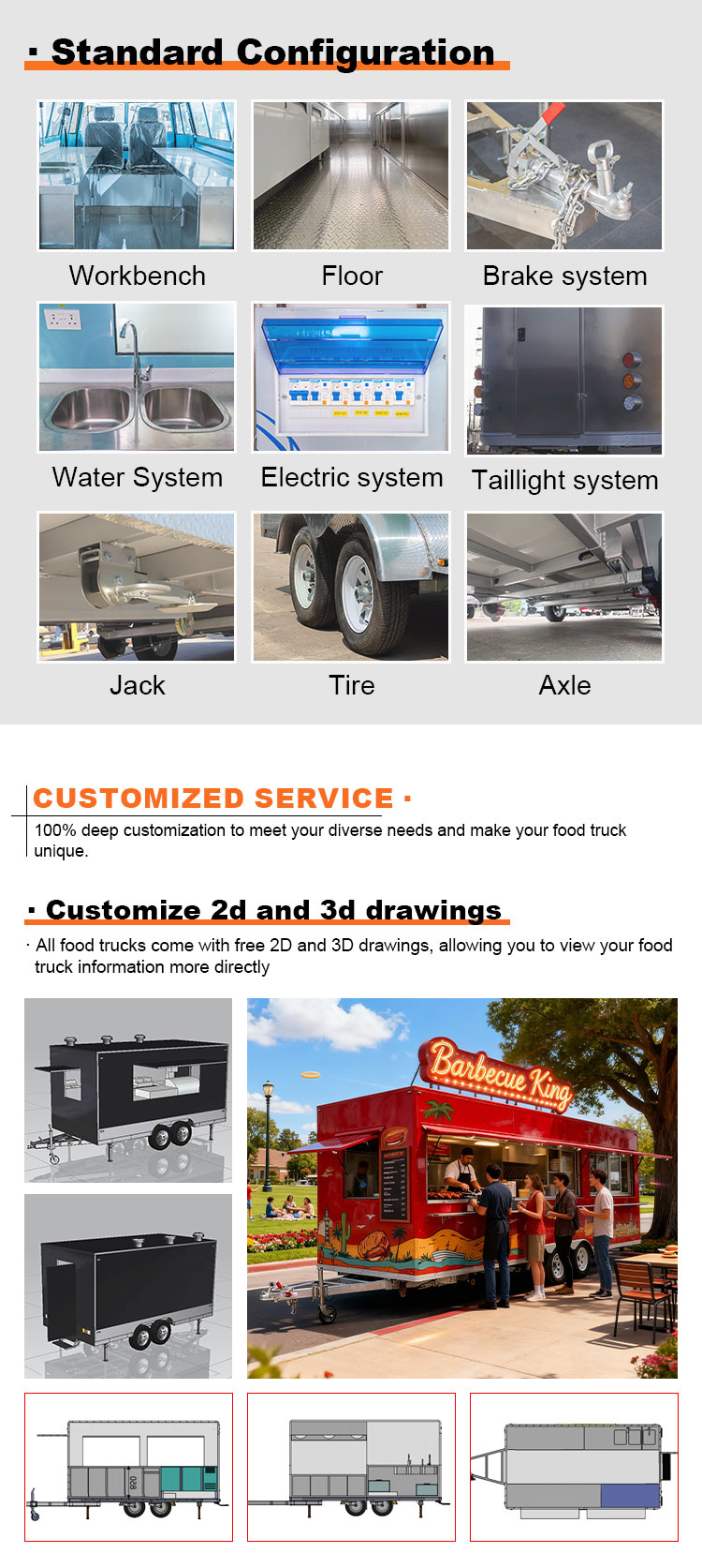 Als hoofdmateriaal hebben we gekozen voor hoogwaardig 304 roestvrij staal, dat bekend staat om zijn uitstekende corrosieweerstand en uitstekende duurzaamheid, en dat stabiele prestaties kan behouden in een verscheidenheid aan omgevingsomstandigheden, waardoor ervoor wordt gezorgd dat onze Food Catering Trailers-producten hun uitstekende kwaliteit en functionaliteit zelfs op de lange termijn kunnen behouden en met een verscheidenheid aan uitdagingen kunnen worden geconfronteerd. De uitstekende weerstand van roestvrij staal 304 tegen corrosie, zodat de truck niet gemakkelijk wordt aangetast door oxidatie of roest, wat de levensduur aanzienlijk verlengt. De uitstekende corrosieweerstand van 304 roestvrij staal maakt de Truck minder gevoelig voor oxidatie of roest, waardoor de levensduur aanzienlijk wordt verlengd.