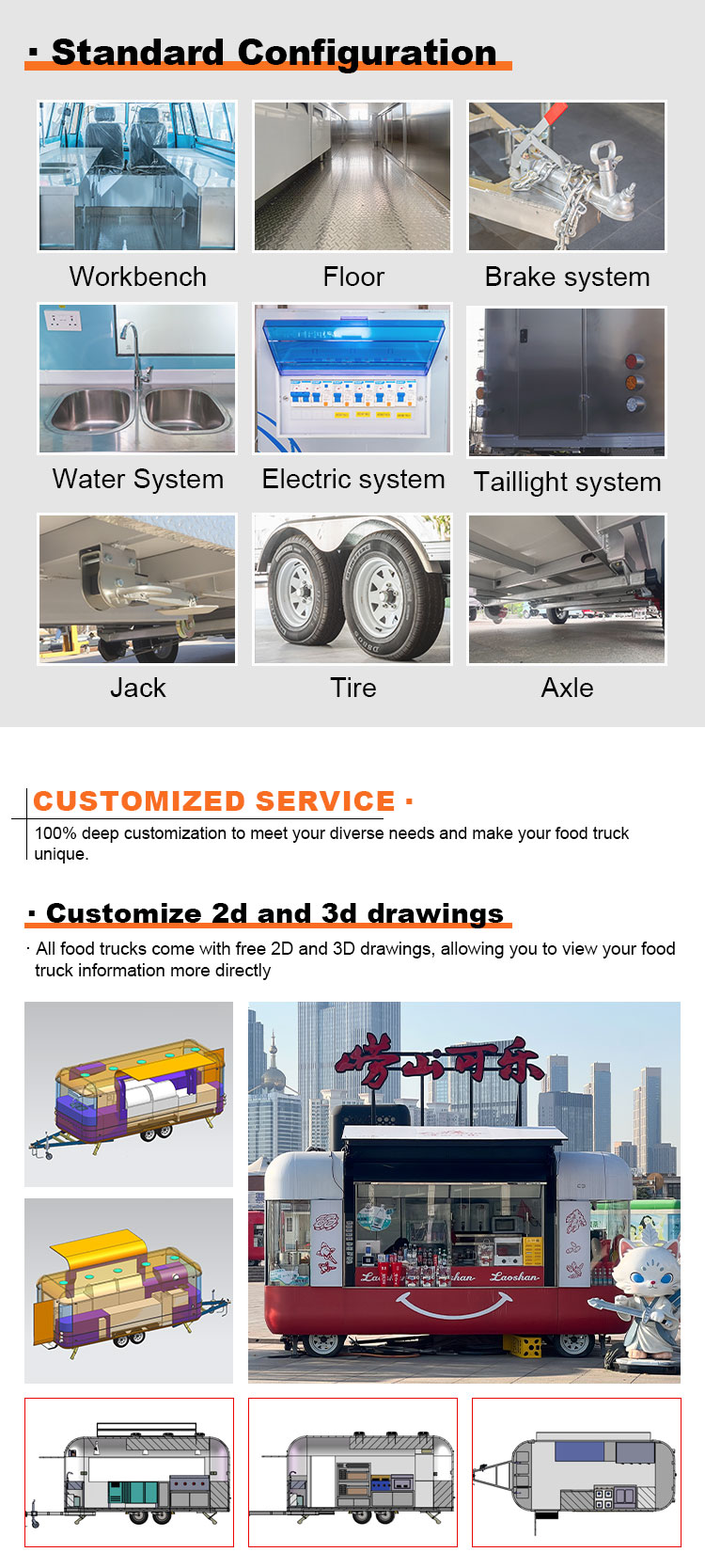 Als hoofdmateriaal hebben we gekozen voor hoogwaardig 304 roestvrij staal, dat bekend staat om zijn uitstekende corrosieweerstand en uitstekende duurzaamheid, en dat stabiele prestaties kan behouden in een verscheidenheid aan omgevingsomstandigheden, waardoor ervoor wordt gezorgd dat onze Food Catering Trailers-producten hun uitstekende kwaliteit en functionaliteit zelfs op de lange termijn kunnen behouden en met een verscheidenheid aan uitdagingen kunnen worden geconfronteerd. De uitstekende weerstand van roestvrij staal 304 tegen corrosie, zodat de truck niet gemakkelijk wordt aangetast door oxidatie of roest, wat de levensduur aanzienlijk verlengt. De uitstekende corrosieweerstand van 304 roestvrij staal maakt de Truck minder gevoelig voor oxidatie of roest, waardoor de levensduur aanzienlijk wordt verlengd.