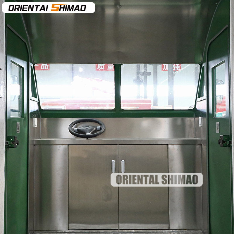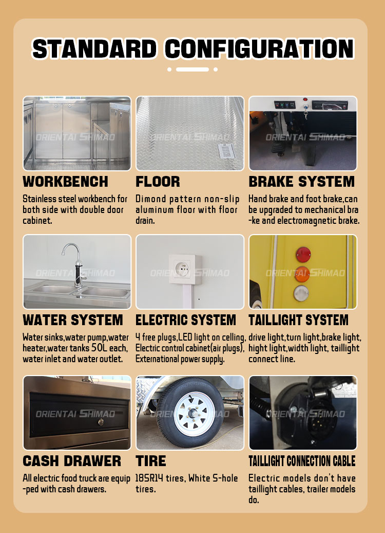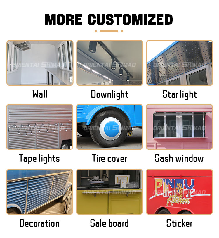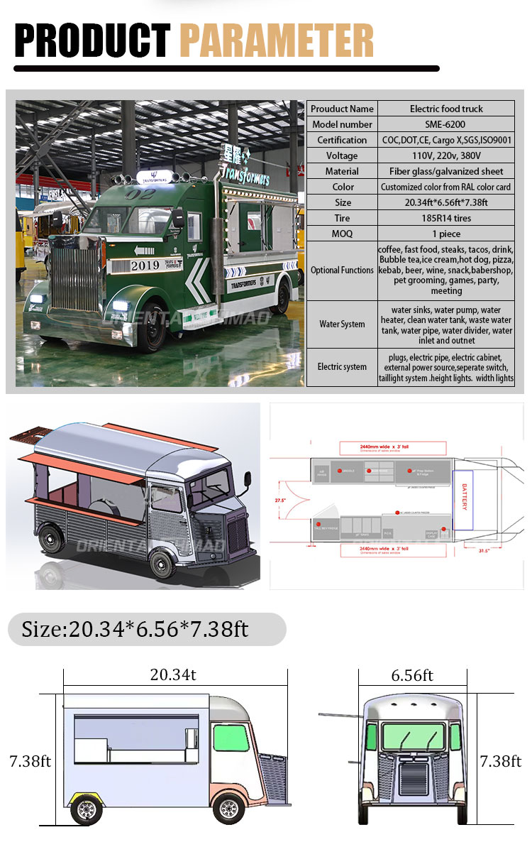 Heet verkopen elektrisch voedselbusje met hoogwaardige gegalvaniseerde plaatstaal- en vezelglasmaterialen. Schilderen kan worden aangepast met speciale vereiste. Inside werkbank met kast wordt gemaakt door 304 roestvrij stalen materiaal, de vloer wordt gemaakt door niet-slip aluminium.