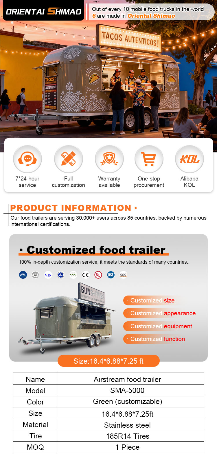 We kunnen Food Catering Trailers-certificeringen aanbieden: DOT, CE, SGS, SCI, ISO, COC,