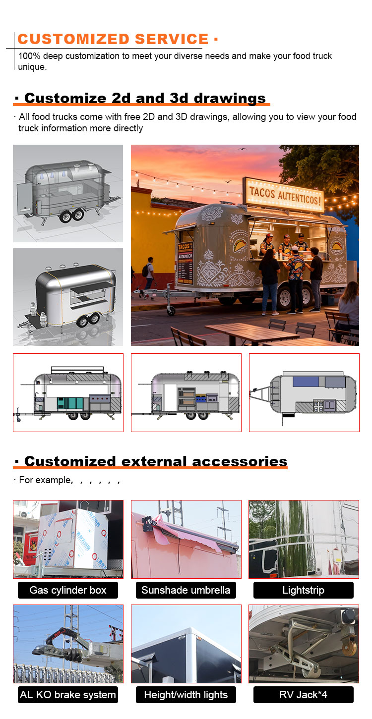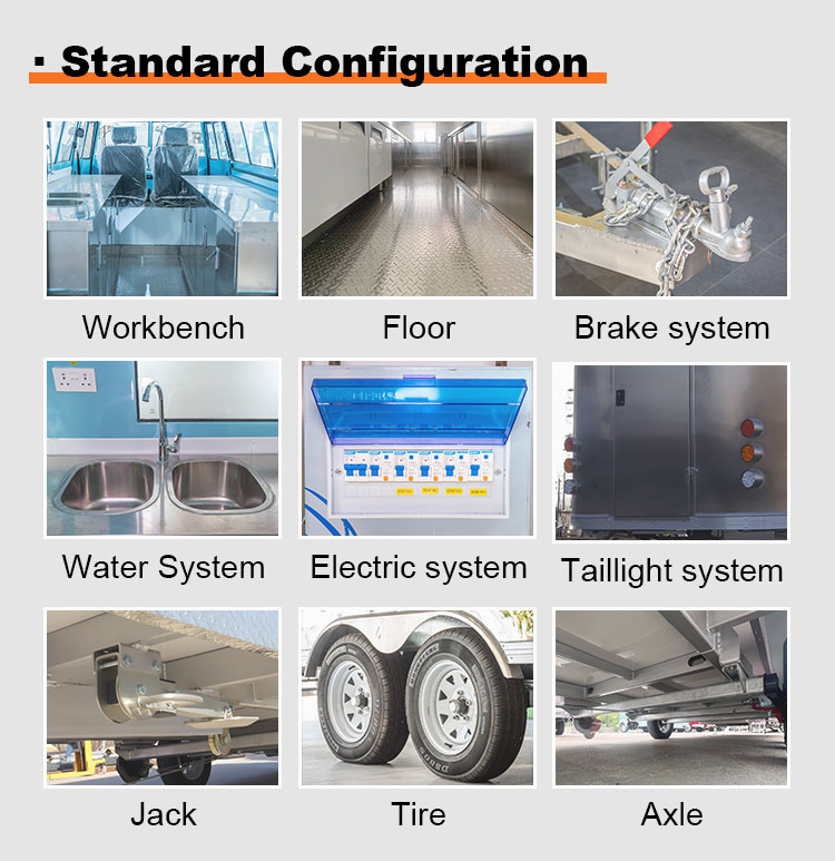 Als hoofdmateriaal hebben we gekozen voor hoogwaardig 304 roestvrij staal, dat bekend staat om zijn uitstekende corrosieweerstand en uitstekende duurzaamheid, en dat stabiele prestaties kan behouden in een verscheidenheid aan omgevingsomstandigheden, waardoor wordt gegarandeerd dat onze Food Catering Trailers-producten hun uitstekende kwaliteit en functionaliteit zelfs op de lange termijn kunnen behouden en met een verscheidenheid aan uitdagingen kunnen worden geconfronteerd. De uitstekende weerstand van roestvrij staal 304 tegen corrosie, zodat de truck niet gemakkelijk wordt aangetast door oxidatie of roest, wat de levensduur aanzienlijk verlengt. De uitstekende corrosieweerstand van 304 roestvrij staal maakt de Truck minder gevoelig voor oxidatie of roest, waardoor de levensduur aanzienlijk wordt verlengd.