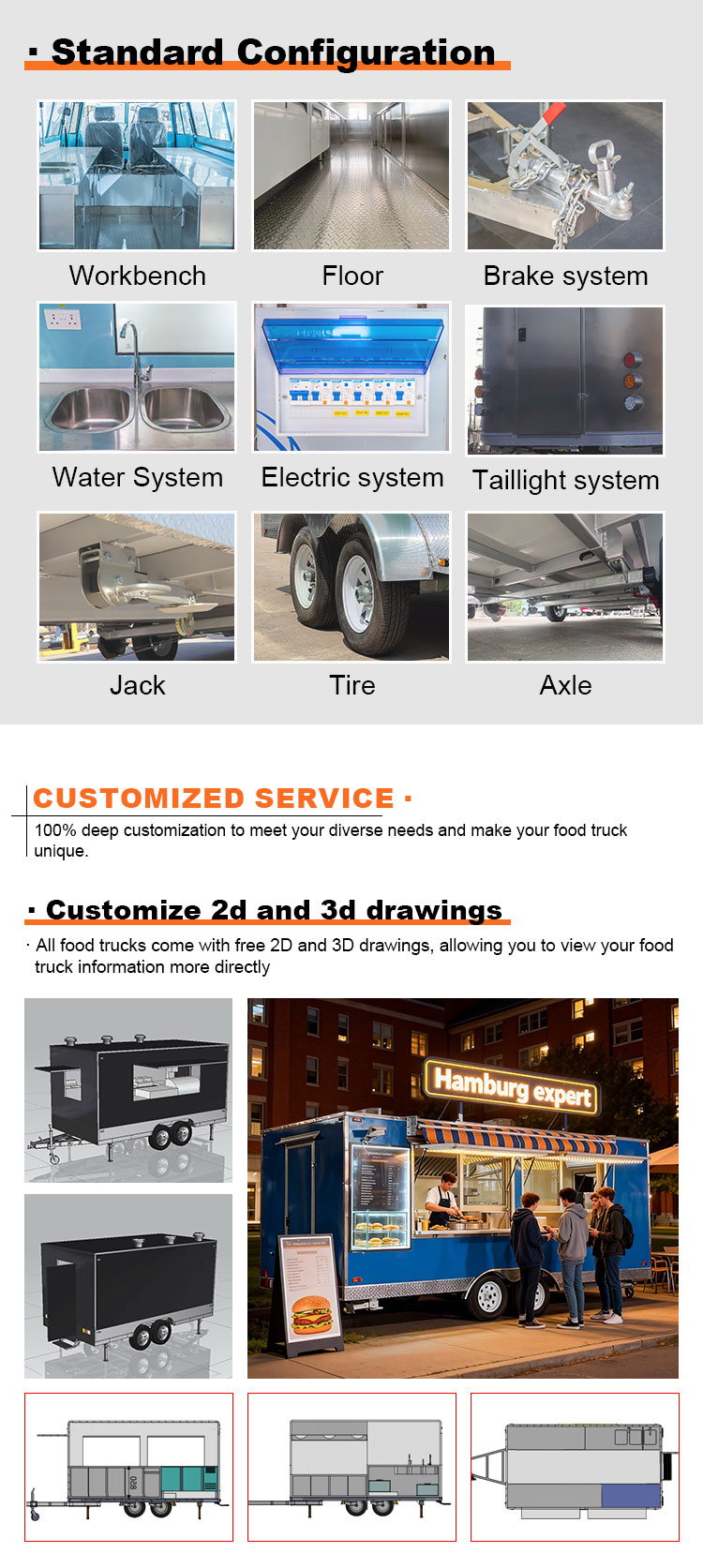 Materiaal en proces: Kies hoogwaardige materialen en een geavanceerd productieproces om ervoor te zorgen dat het uiterlijk van de foodtruck mooi en duurzaam is.