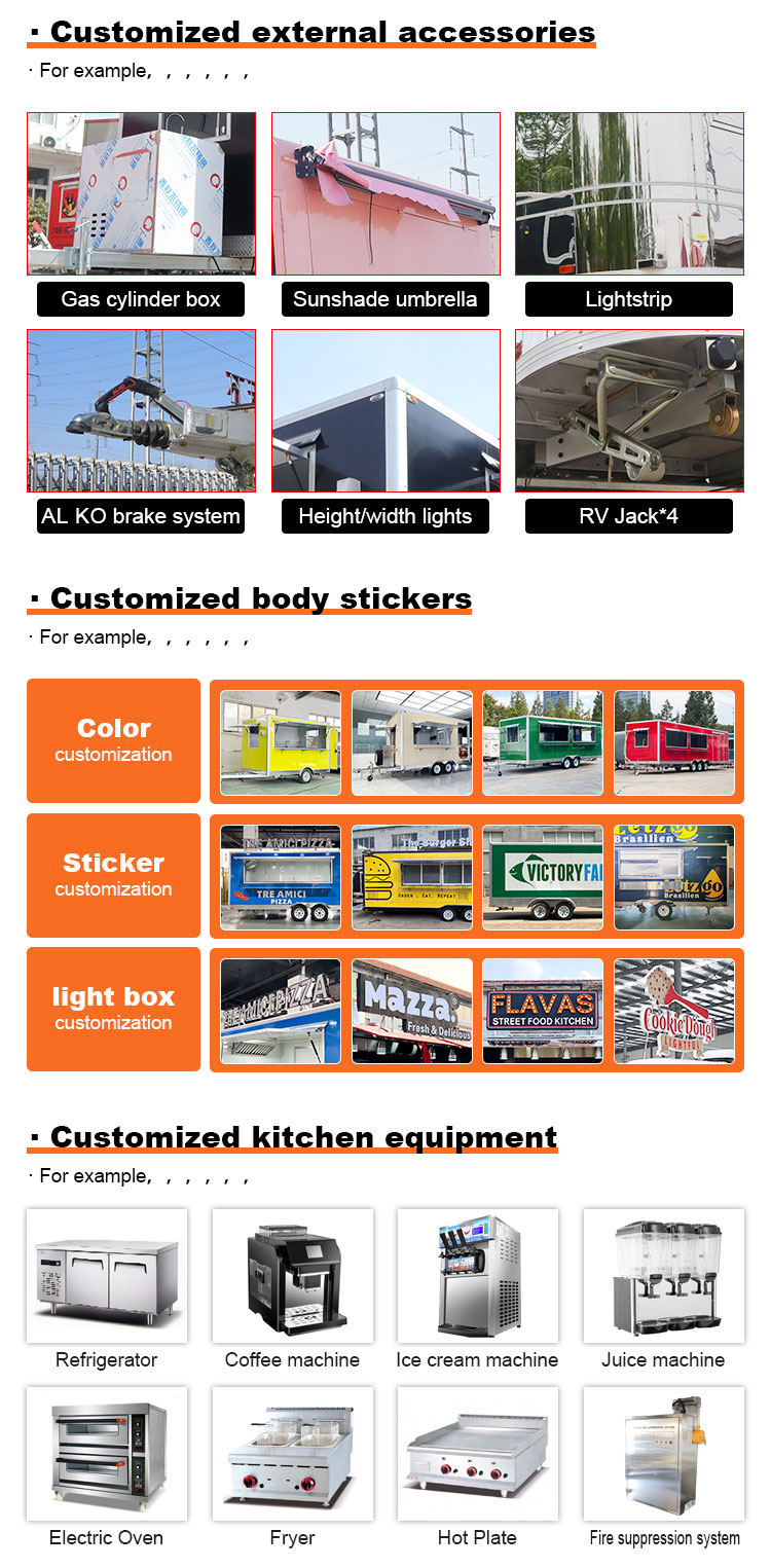 Modellering en stijl: het uiterlijk, modellering en stijl van de foodtruck is een belangrijke factor om klanten aan te trekken. Het kan worden aangepast aan het merkimago van de klant, zakelijke kenmerken of persoonlijke voorkeuren, zoals een gestroomlijnd ontwerp, retrostijl, moderne eenvoud enzovoort.