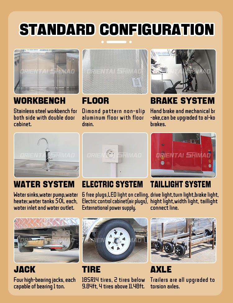 Interieurindeling: de interieurindeling van de trailer is zorgvuldig ontworpen en kan flexibel worden aangepast aan verschillende zakelijke behoeften. Zowel de plaatsing van keukenapparatuur als het ontwerp van de bedrijfstabel houden rekening met het gemak en de efficiëntie van de gebruiker.