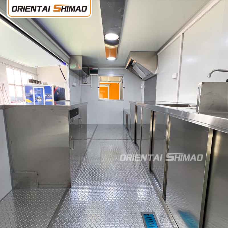 Veelzijdigheid: Om aan de behoeften van verschillende cateringscenario's te voldoen, is een verscheidenheid aan professionele kook- en opslagapparatuur in het voertuig ingebouwd, variërend van kookgerei tot opslagruimte voor ingrediënten, die kunnen voldoen aan de behoeften van gediversifieerde en zeer efficiënte cateringactiviteiten, en de operationele efficiëntie aanzienlijk kunnen verbeteren, of het nu gaat om koken op locatie of het bezorgen van fastfood.