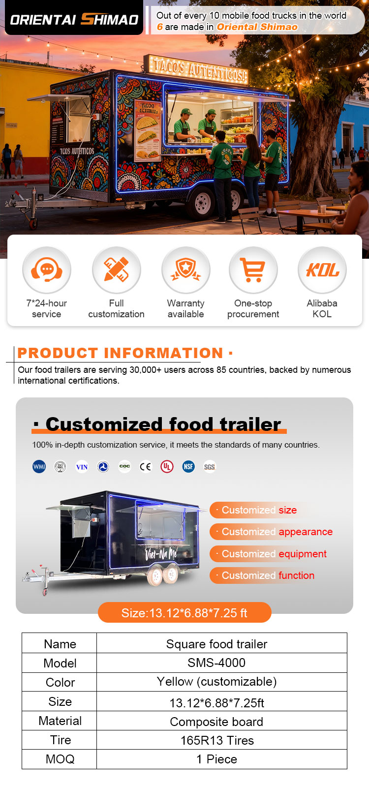 We kunnen Food Catering Trailers-certificeringen aanbieden: DOT, CE, SGS, SCI, ISO, COC,