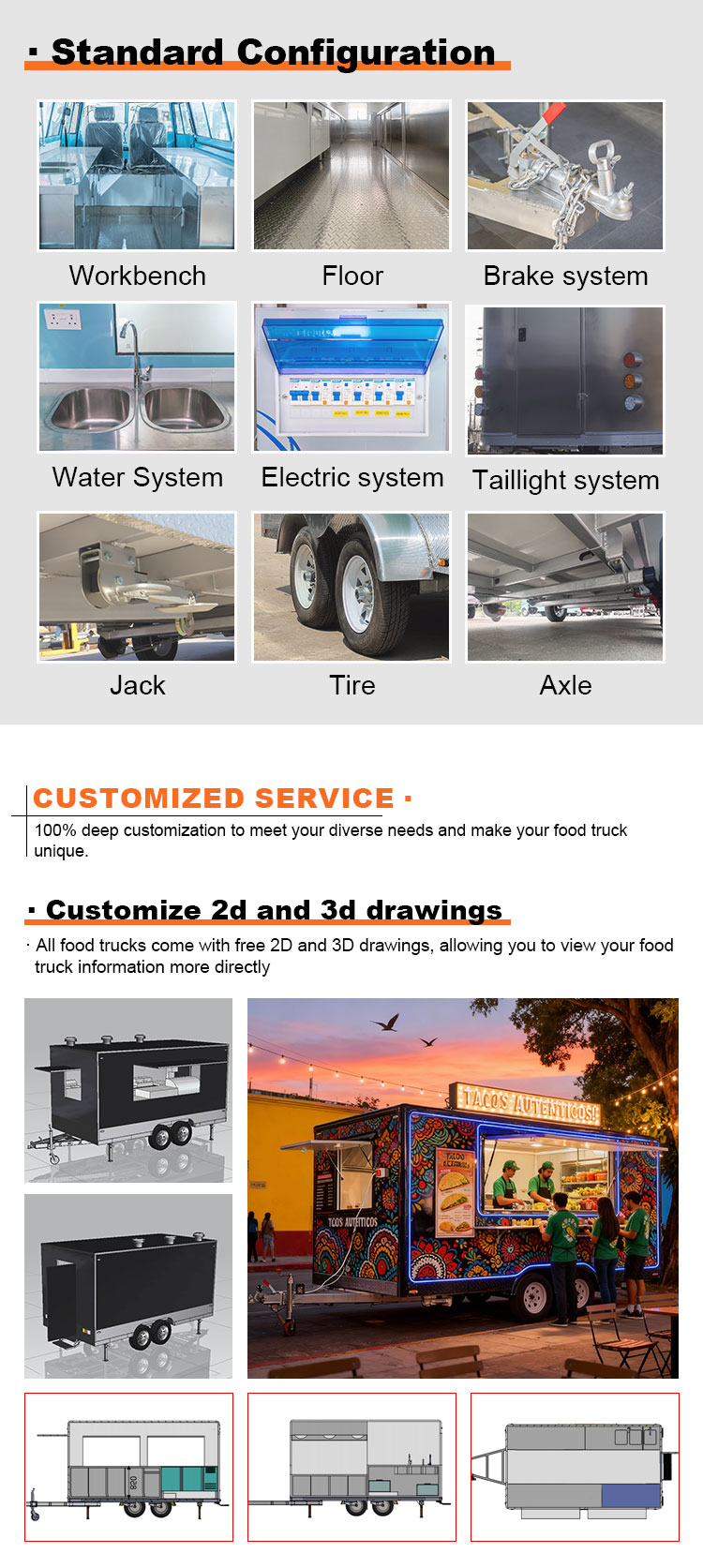 Als hoofdmateriaal hebben we gekozen voor hoogwaardig 304 roestvrij staal, dat bekend staat om zijn uitstekende corrosieweerstand en uitstekende duurzaamheid, en dat stabiele prestaties kan behouden in een verscheidenheid aan omgevingsomstandigheden, waardoor ervoor wordt gezorgd dat onze Food Catering Trailers-producten hun uitstekende kwaliteit en functionaliteit zelfs op de lange termijn kunnen behouden en met een verscheidenheid aan uitdagingen kunnen worden geconfronteerd. De uitstekende weerstand van roestvrij staal 304 tegen corrosie, zodat de truck niet gemakkelijk wordt aangetast door oxidatie of roest, wat de levensduur aanzienlijk verlengt. De uitstekende corrosieweerstand van 304 roestvrij staal maakt de Truck minder gevoelig voor oxidatie of roest, waardoor de levensduur aanzienlijk wordt verlengd.