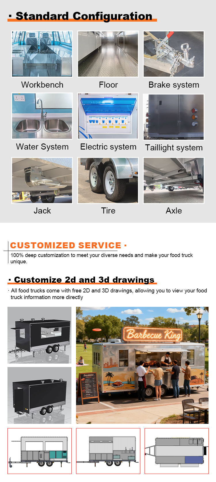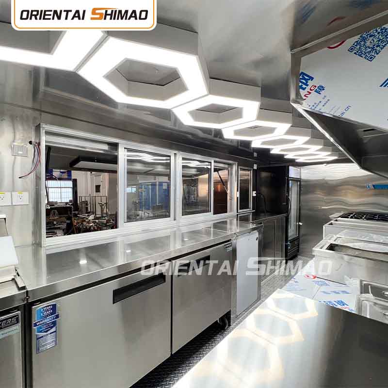 Als hoofdmateriaal hebben we gekozen voor hoogwaardig 304 roestvrij staal, dat bekend staat om zijn uitstekende corrosieweerstand en uitstekende duurzaamheid, en dat stabiele prestaties kan behouden in een verscheidenheid aan omgevingsomstandigheden, waardoor ervoor wordt gezorgd dat onze Mobile Food Truck Trailer-producten hun uitstekende kwaliteit en functionaliteit zelfs op de lange termijn kunnen behouden en met een verscheidenheid aan uitdagingen kunnen worden geconfronteerd. De uitstekende weerstand van roestvrij staal 304 tegen corrosie, zodat de truck niet gemakkelijk wordt aangetast door oxidatie of roest, wat de levensduur aanzienlijk verlengt. De uitstekende corrosieweerstand van 304 roestvrij staal maakt de Truck minder gevoelig voor oxidatie of roest, waardoor de levensduur aanzienlijk wordt verlengd.