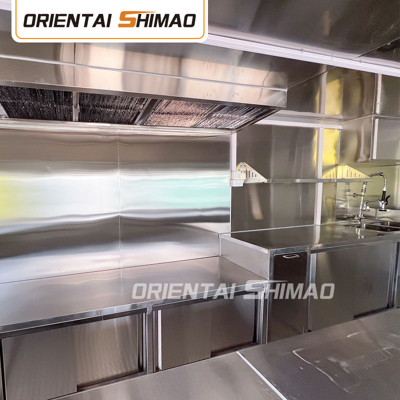 Roestvrij staal: Roestvrij staal is ook een van de meest voorkomende keuzes voor buitenpanelen, vooral 304 roestvrij staal van voedingskwaliteit. Roestvrij staal is corrosiebestendig, hittebestendig en gemakkelijk schoon te maken, waardoor het geschikt is voor gebruik in keukens, toonbanken en andere ruimtes van foodtrucks die in contact komen met voedsel. Tegelijkertijd kan de schoonheid van roestvrij staal ook de algehele textuur van de foodtruck verbeteren.